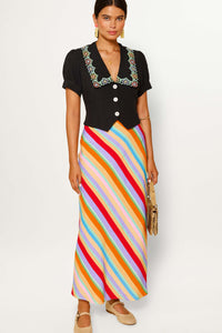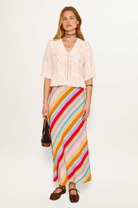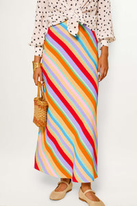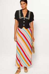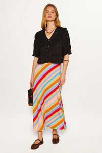 Vintage-inspired midi and mini skirts in luxury fabrics and hand-painted prints.